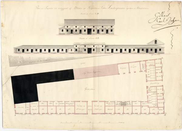 Plan och Facader till ombyggnad af Uthusen på Högvälborne Fröken Lantingshausens egendom på Blaiseholmen